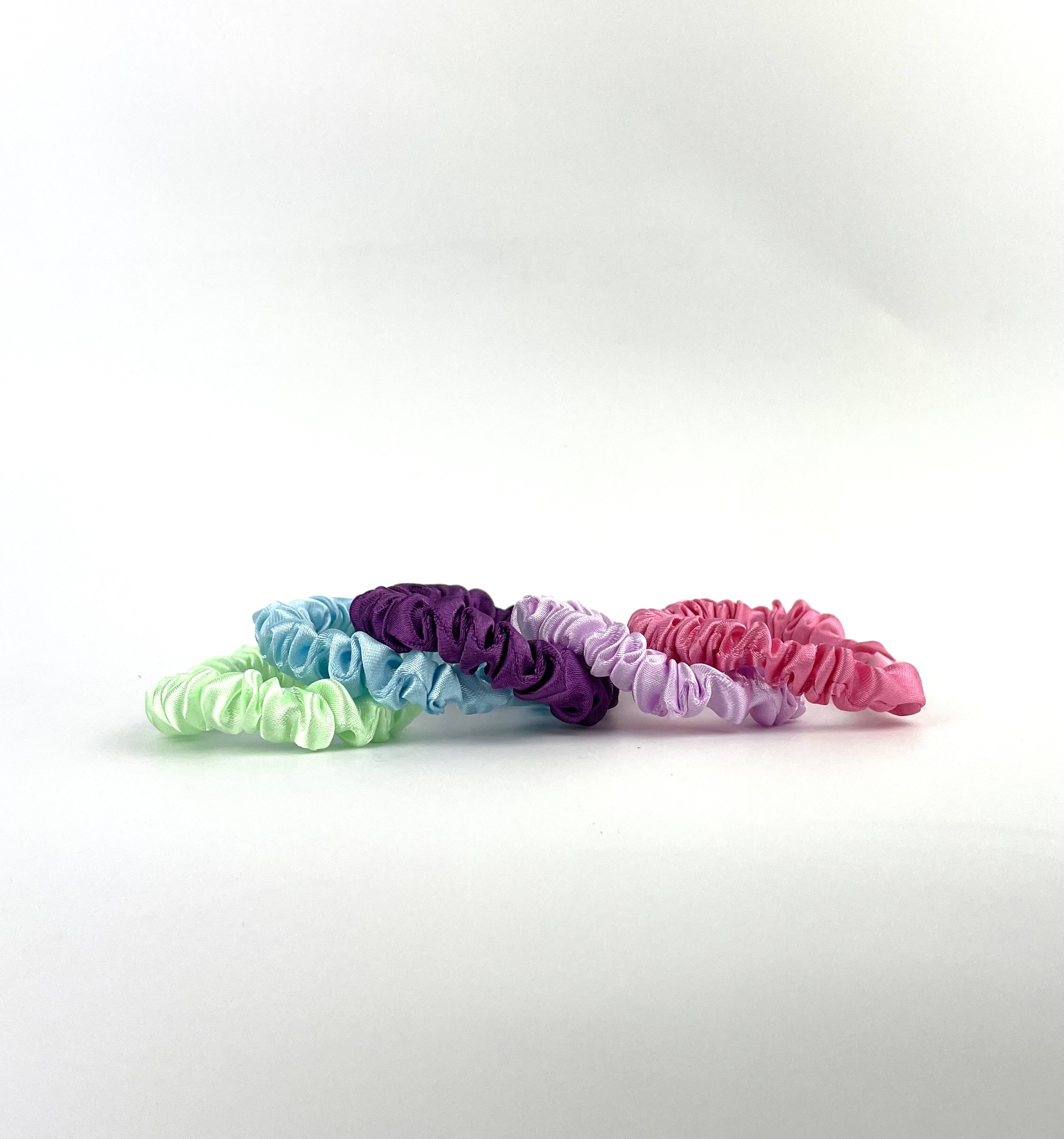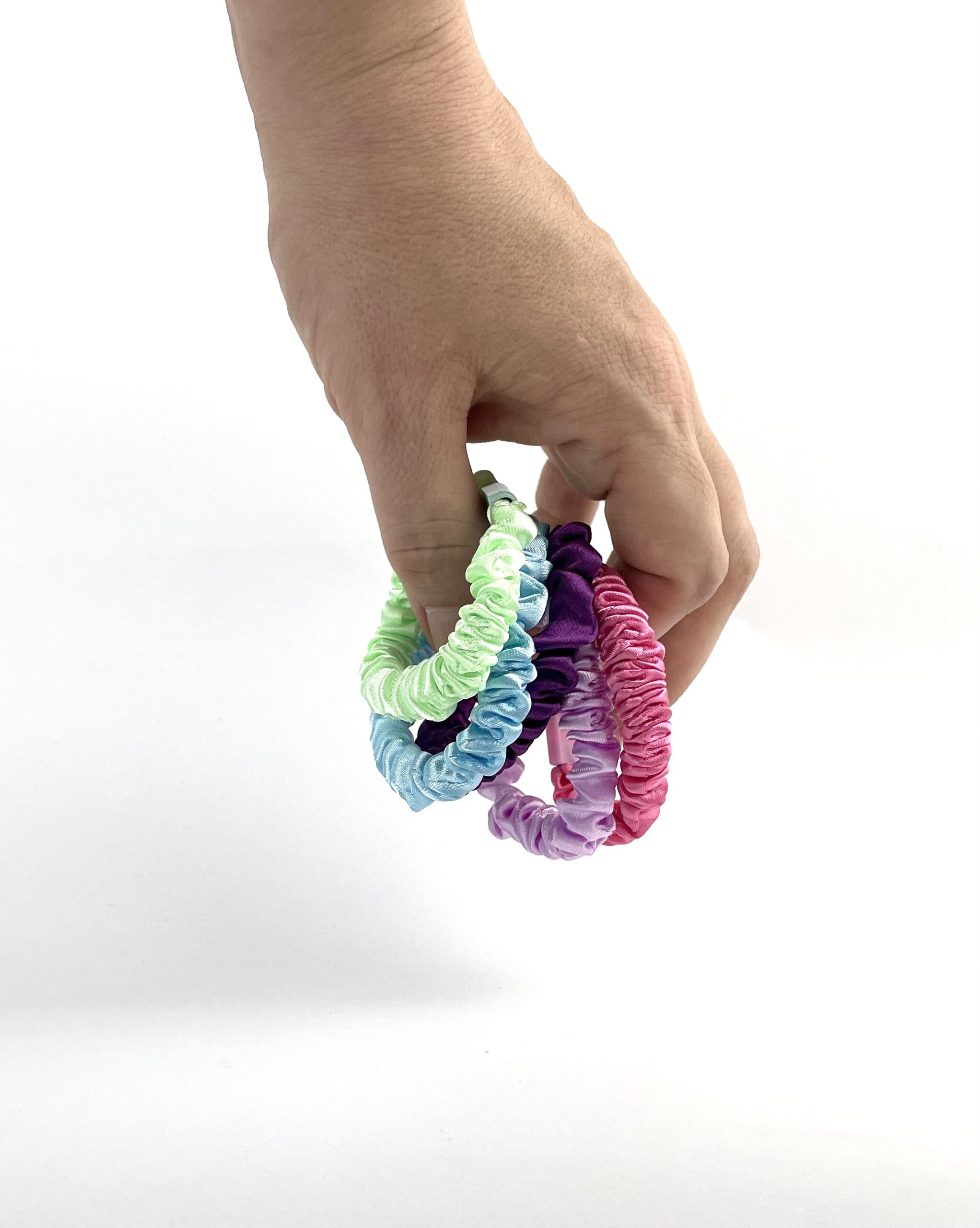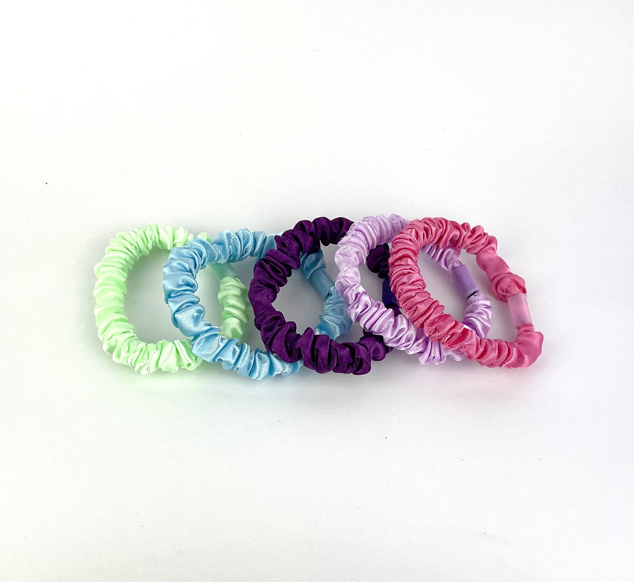 Dette sæt satin hårelastikker er skabt til dig, der ønsker et stilrent og funktionelt accessory med et elegant udtryk. Sættet indeholder fem hårelastikker i forskellige, harmoniske farver, som gør det nemt at variere dit look og tilpasse din styling efter både humør og anledning.