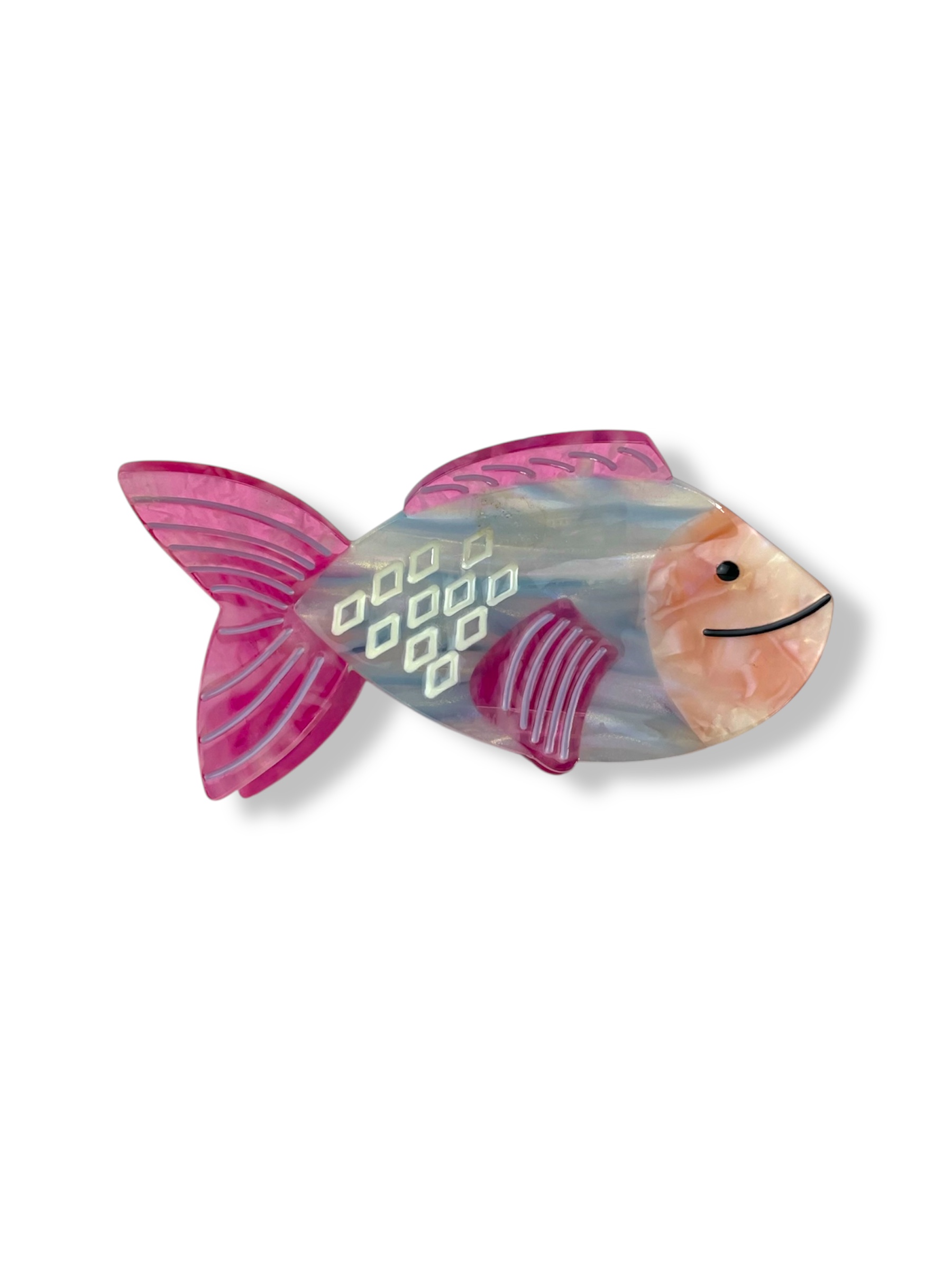 Hårklemmen er designet med fine detaljer, der fremhæver fiskens form og mønstre. De forskellige farver skaber et livligt og dekorativt udtryk, som gør hårklemmen til en smuk detalje i håret. Kombinationen af farver giver samtidig hårklemmen et let og sommerligt look.
