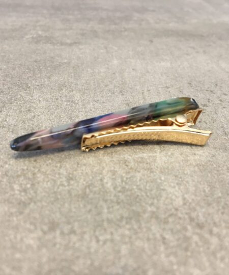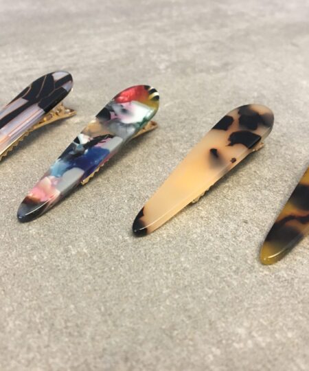 Lille dråbe formet hårklemme i farve mix, lavet af acetat med en metal klemme på bagsiden. Måler 5cm