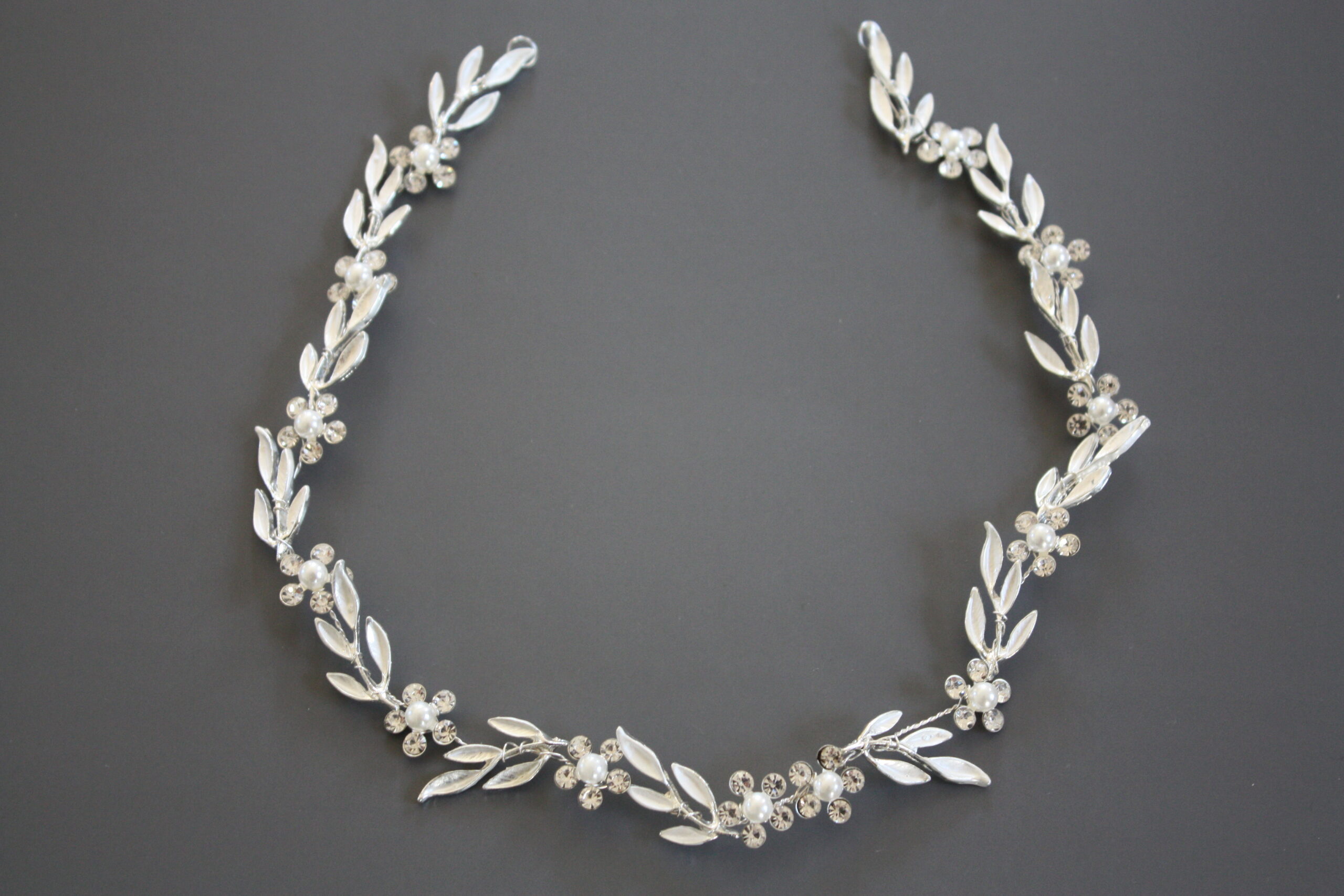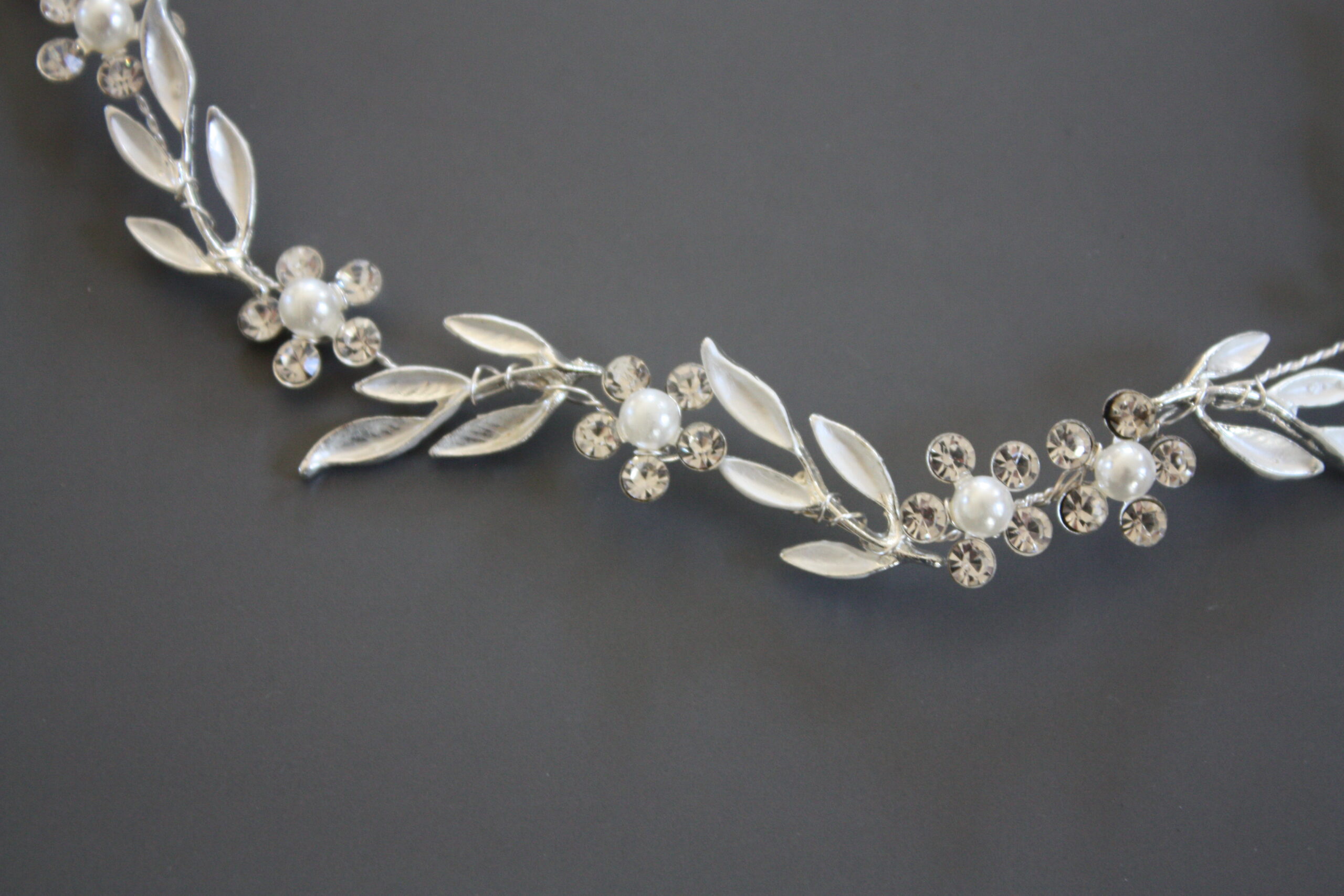 Sølvfarvet wire besat med blomster og perler.